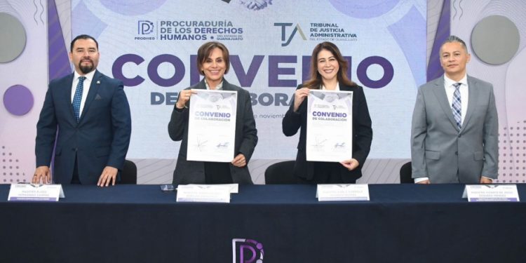 LEÓN, GTO.- La Procuraduría de los Derechos Humanos del Estado de Guanajuato (PRODHEG) y el Tribunal de Justicia Administrativa del Estado de Guanajuato (TJA) firmaron un Convenio Marco de Colaboración Institucional con el objetivo de promover acciones conjuntas de capacitación, profesionalización y difusión de la cultura de los derechos humanos.
