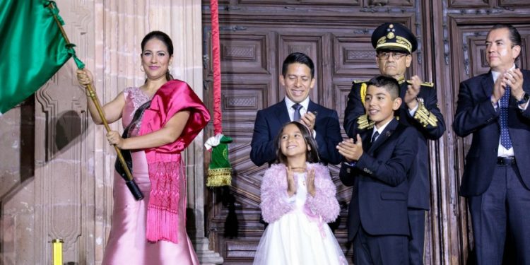 En el atrio de la Parroquia, la Gobernadora hizo zona sonar la campana de Dolores y lanzó la arenga del Grito de la Independencia:
