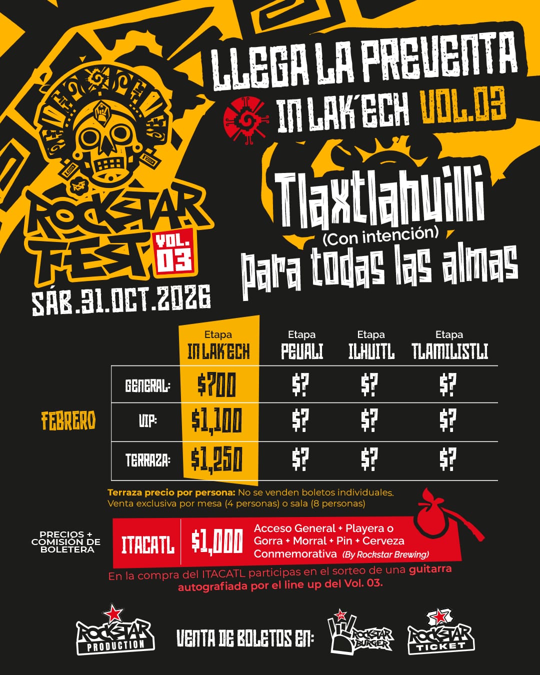 La preventa denominada “In Lak’ech” arrancó con precios de $700 en General, $1,100 en VIP y $1,250 en Terraza (más cargo). Además, se ofrece el paquete especial “Itacatl”, con un costo de $1,000, que incluye acceso a zona general, playera o gorra de edición limitada, morral, pin, cerveza conmemorativa y la oportunidad de participar en el sorteo de una guitarra autografiada por las bandas participantes.